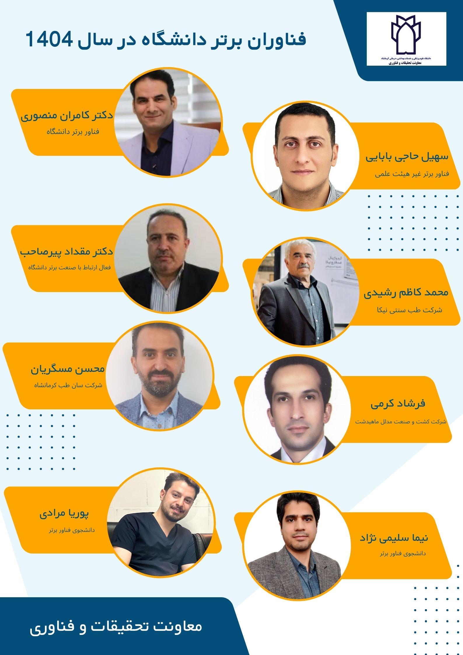 به گزارش روابط عمومی دانشگاه و به نقل از معاونت تحقیقات و فناوری، فناوران برتر دانشگاه علوم پزشکی کرمانشاه در سال 1404 معرفی شدند.